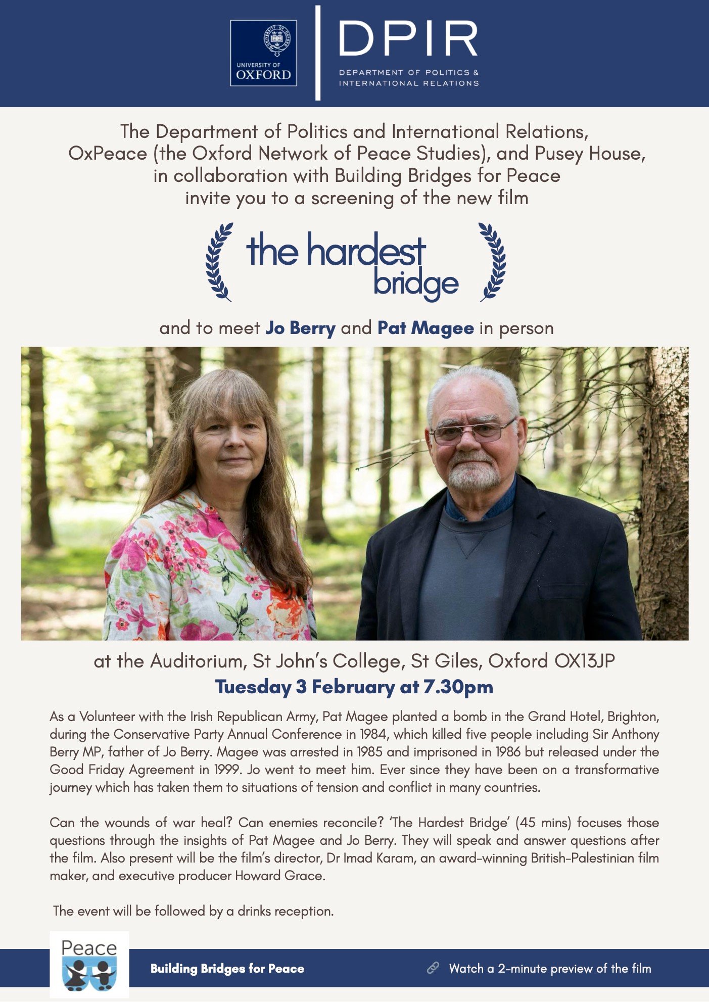 Pat Magee and Jo Berry will be present in person to speak and answer questions after the film. Also present will be the film’s director, Dr Imad Karam, an award-winning British-Palestinian film maker, and executive producer Howard Grace. Followed by a drinks reception.